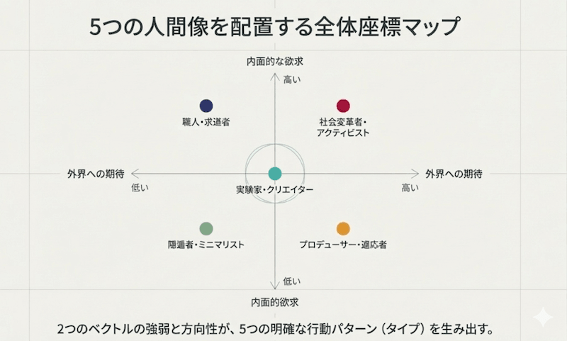 内面の欲求が極めて強く、外界への期待は最小限。世間がどうあろうと「自分が納得できるか」が全て。