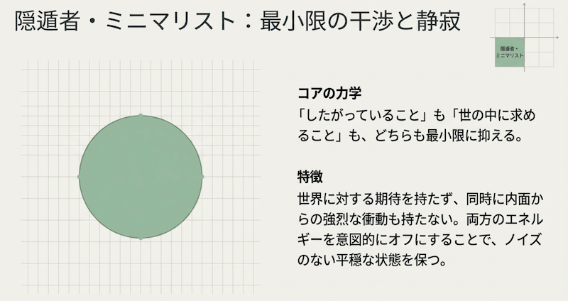 平穏を守ることを最優先する低電力設定。仕事で言うと、個人投資家、フリーランス、隠居生活の人のようなイメージです。